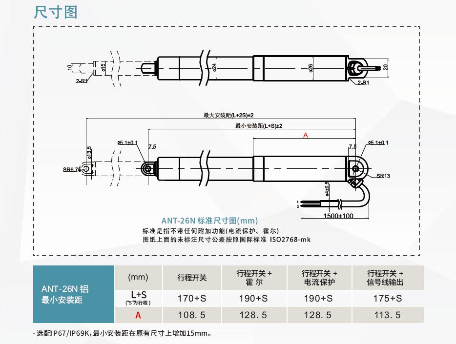 ANT-26N是ANT-26的升級版本,可同時內(nèi)置限位開關(guān)加過流保護(hù)電路或內(nèi)置限位開關(guān)加霍爾反饋; 最大外徑26mm,最大推拉?500N,可很好的適用于對安裝空間和負(fù)載同時擁有高要求的應(yīng)用中; 最高IP66/IP67/IP69K的防護(hù)等級確保ANT-26N良好的戶外工作表現(xiàn); 主要應(yīng)用于電動百葉窗,電動遮陽棚,電動輪椅,檢測機器人。